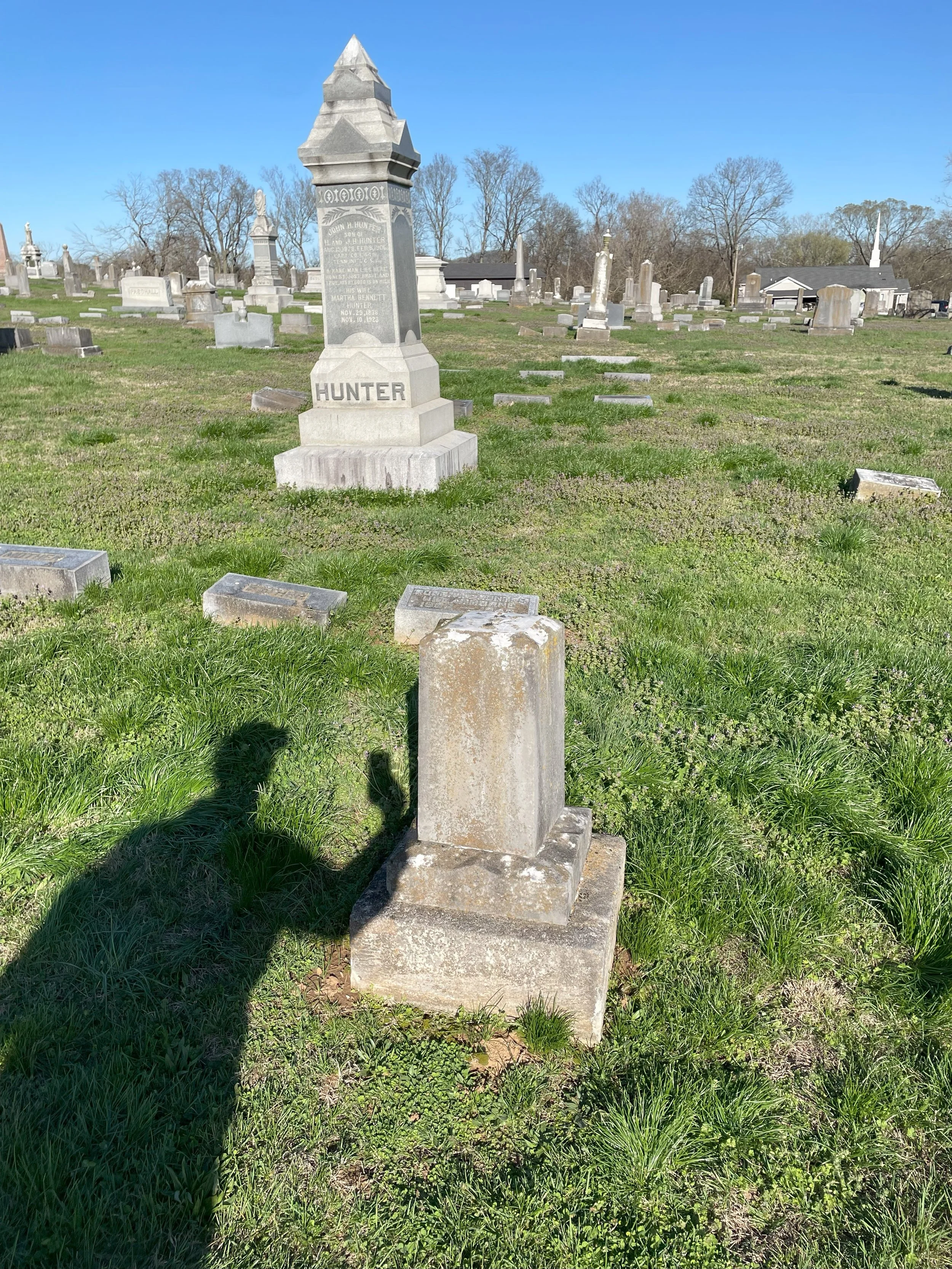 This grave was a fun challenge to “unearth” (which is not a term to use in graveyards too often). His Find A Grave profile said he was buried in the Mount Hope Cemetery in Franklin, TN but there were no monument pics. While I was in Franklin one Saturday evening for some pre-wedding activities for my son’s upcoming nuptials I decided to see if I could find him and headed to Mt. Hope (Minnie Pearl is also buried there and I went by and gave a “How-dee”). I walked past the plot where Bennett was supposedly located and couldn’t find anything. I got in my steps that day walking all around and back and forth and nothing.